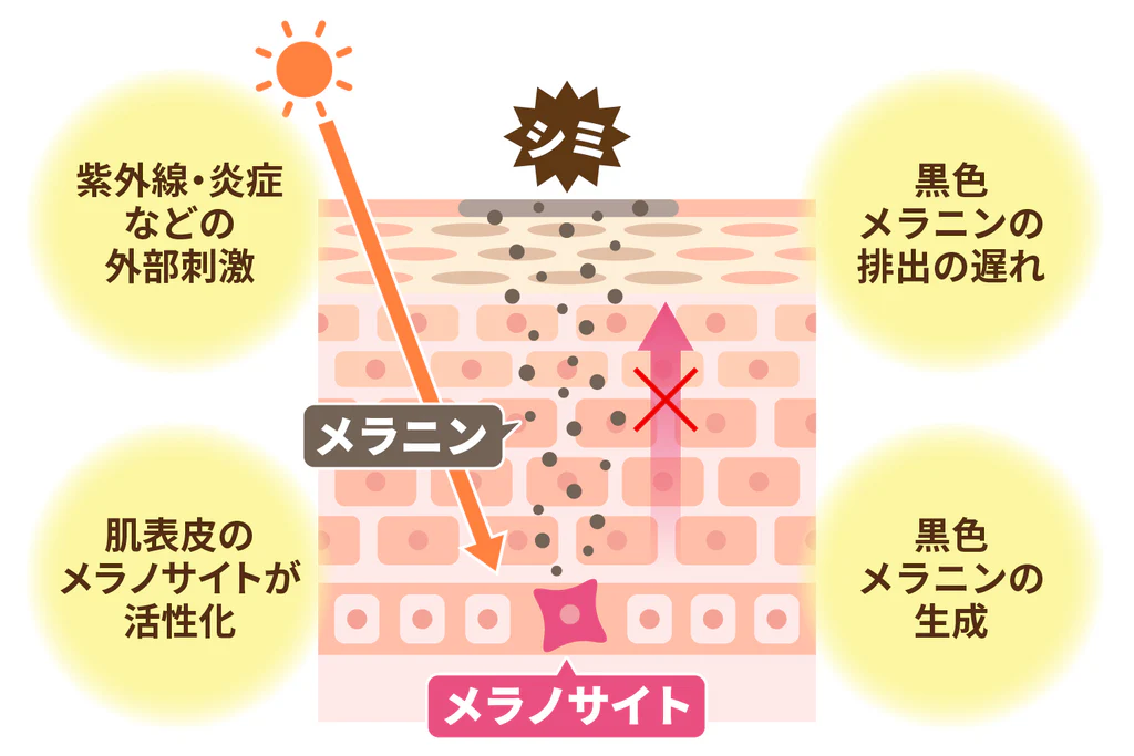 通常は、ターンオーバー(肌の新陳代謝)によって自然に排出されますが、さまざまな要因によって過剰に作られたり、排出のサイクルが乱れると、肌に蓄積して色素沈着が生じます。